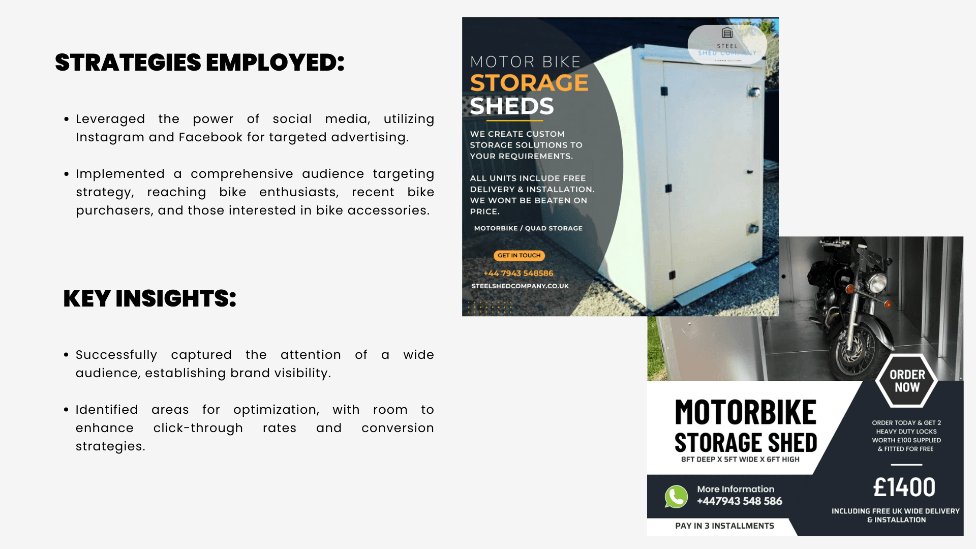 My role encompassed extensive research to understand the audience's specific motivations and challenges, as well as ad creation, copywriting, and creative design. By crafting ads that emphasized the distinct benefits of Steelshed, I connected with the audience’s interests and addressed their needs for bike storage solutions. The campaign was an immense success: not only did it yield a high ROI within the first month, but it also led to advance bookings for Steelshed’s services extending up to eight months. This strategic, tailored approach helped secure Steelshed’s presence in the market and established them as a strong competitor.