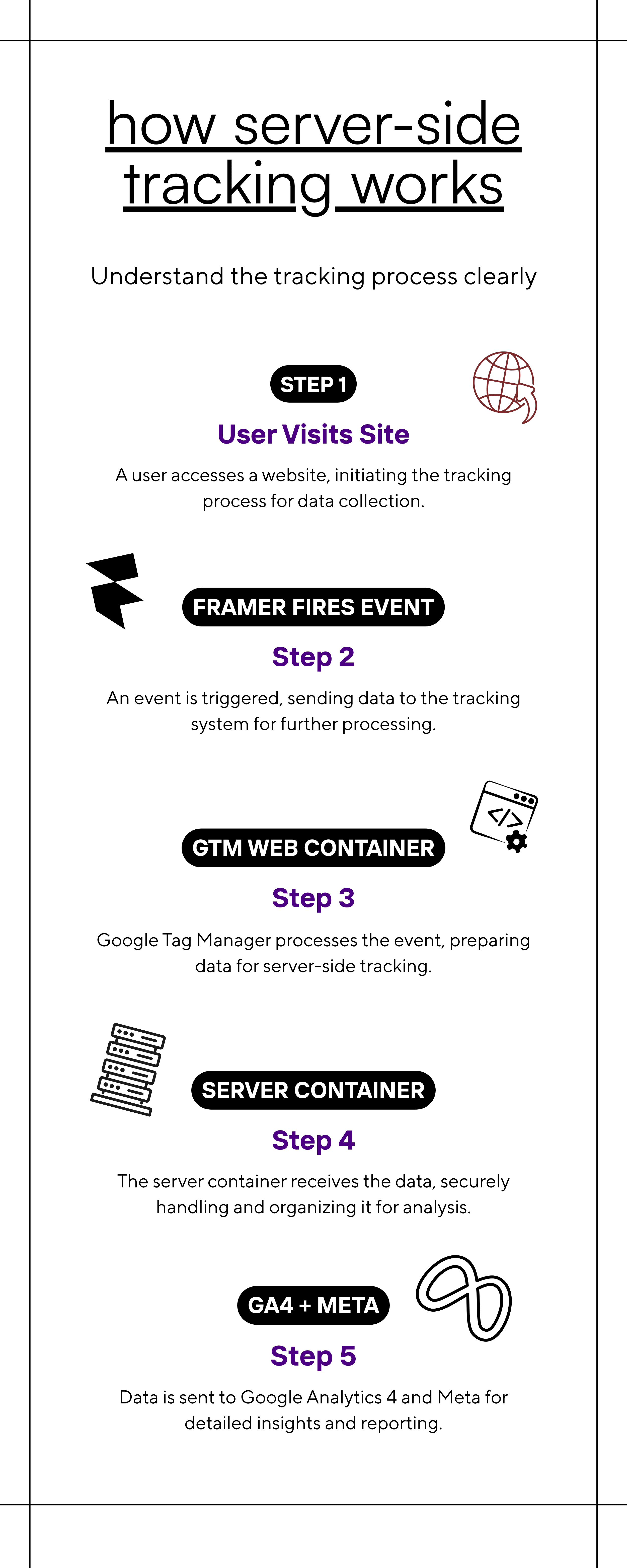 User visits your Framer site -> GTM Web Container fires a small event -> Your GTM Server Container receives it -> Your server forwards it to GA4 and Meta